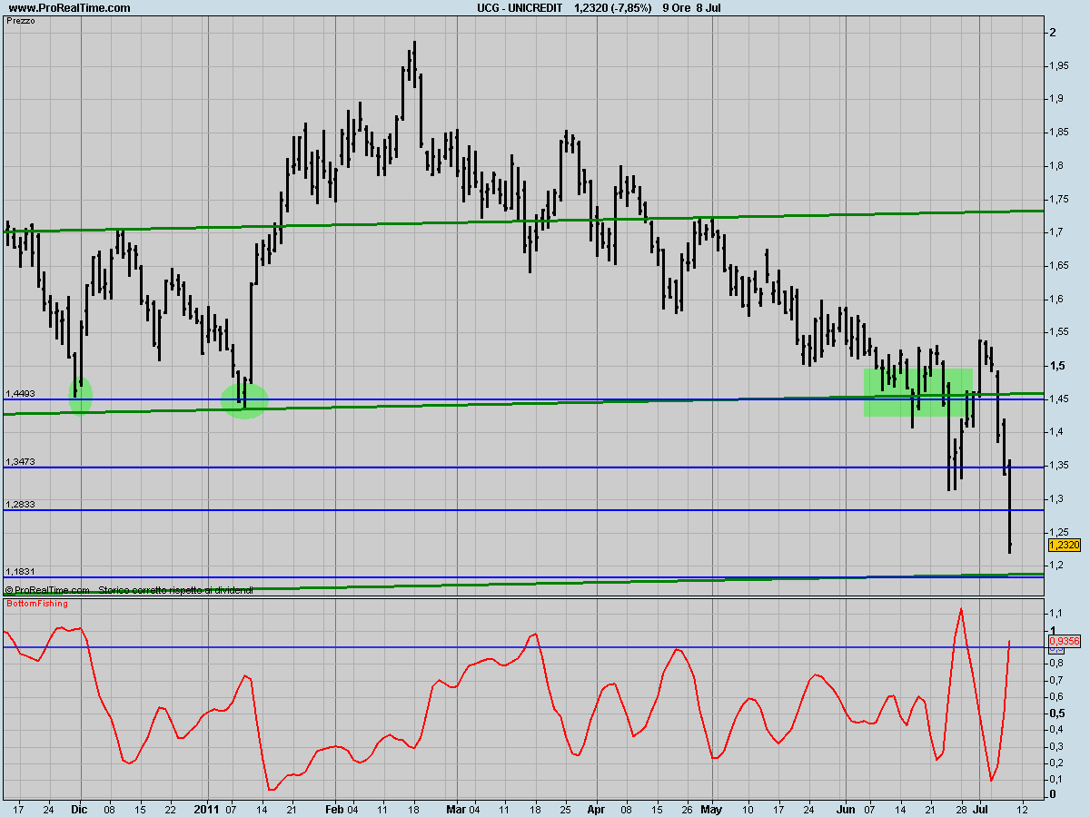 Area 1.45€ ha un forte potere attrattivo per cui ci potrebbero anche essere dei test dal basso di questi livelli. Resta il fatto che il prossimo supporto veramente potente (La Nuova Legge della Vibrazione e Running Bisector danno valori simili) è in area 1.18€. Prima di concludere vi facciamo notare che Bottom Fishing è ancora lungi dal dare un segnale di minimo.”