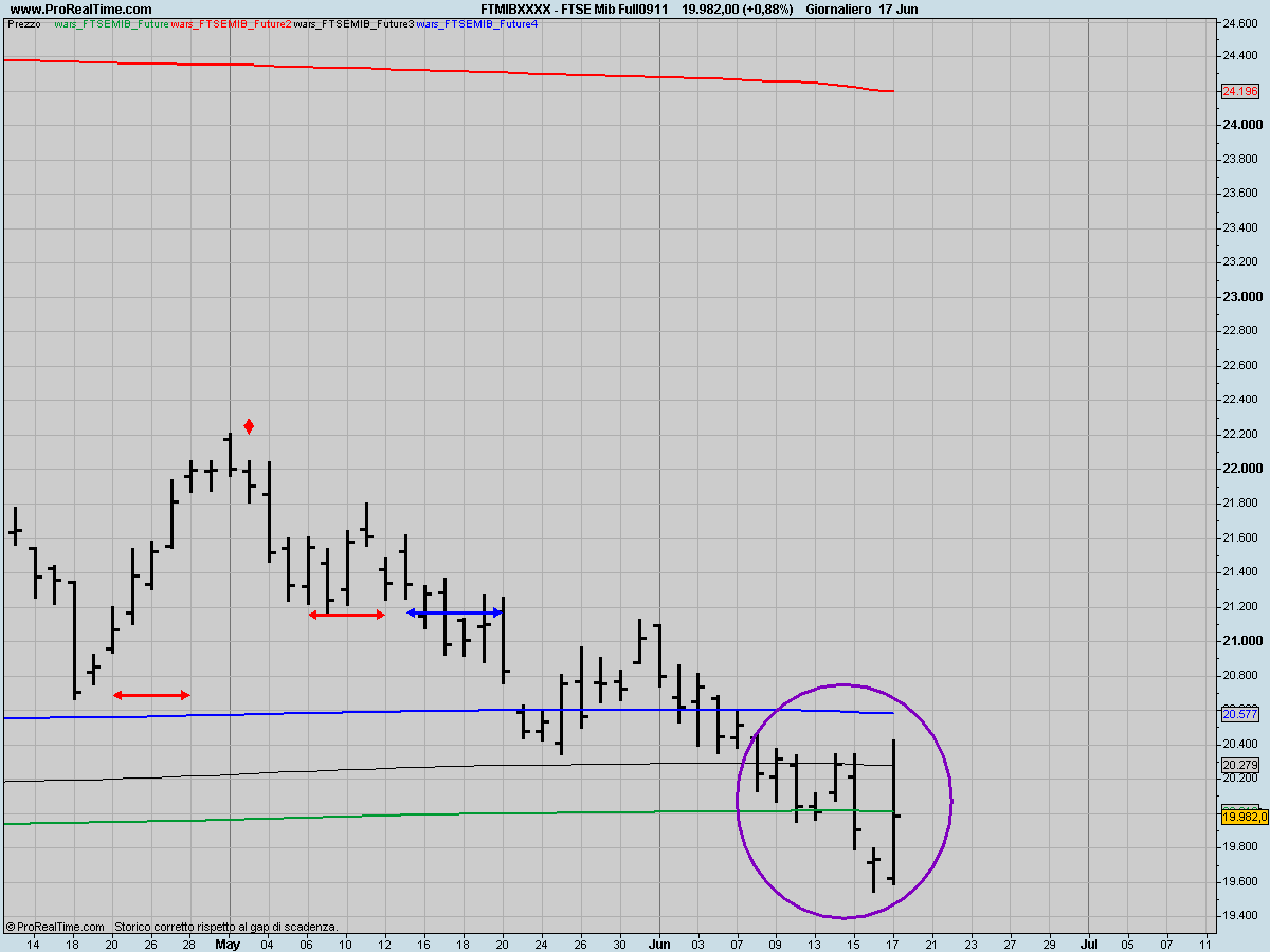 Nella seduta di venerdì abbiamo assistito ad un tentativo di rottura dei livelli indicati dalla linea verde e da quella blu. Dopo una rottura intraday, le quotazioni, però, hanno chiuso sotto la linea verde.