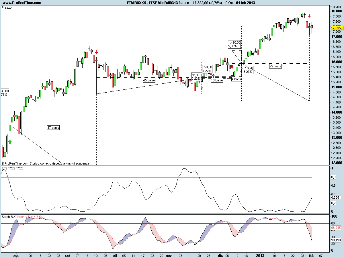Quest’oggi riportiamo anche il grafico dello Stocastico. Il motivo è il seguente. Un nostro cliente che ha acquistato TC2 si è lamentato in quanto non vede differenze rispetto ad indicatori classici quali lo Stocastico e che da’ molti fasi segnali.