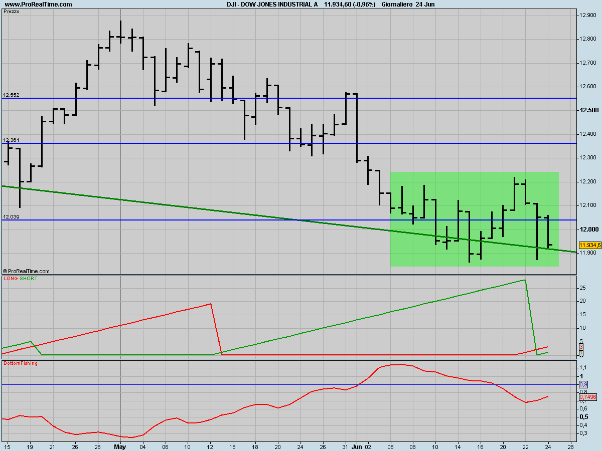 Dopo la discesa iniziata con il massimo del 2 Maggio e proseguita per tutto il mese, le quotazioni del Dow Jones dal 3 al 24 Giugno si sono mosse in un range di circa il 3% (rettangolo verde). Da notare che il trading range si è sviluppato a contatto con i livelli individuati dalla Nuova Legge della Vibrazione (linee blu) e da Running Bisector (linee verde).
