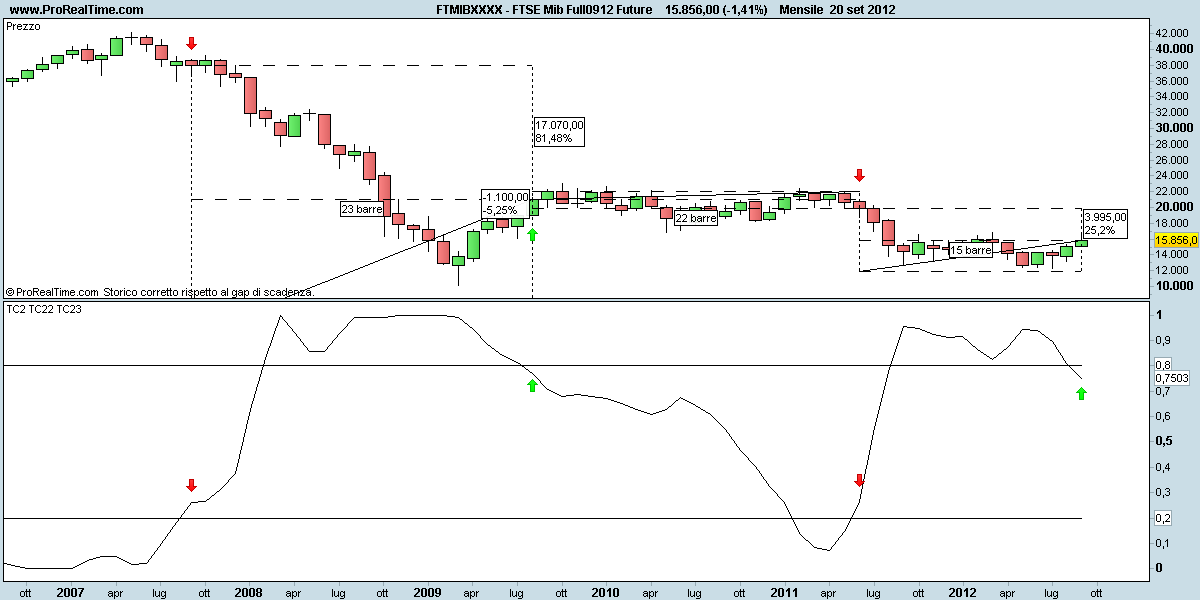 Da oggi vogliamo commentare il comportamento dell’indicatore TC2 su diversi time-frames. Iniziamo con il time frame mensile e il Future FTSE MIB.