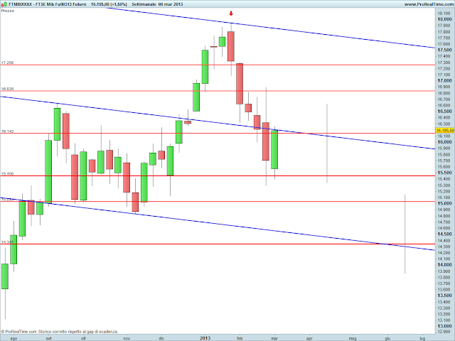 Dopo il segnale ribassista generato alla chiusura della settimana del 28 Gennaio, abbiamo effettuato una proiezione ribassista il cui obiettivo naturale era area 16100 per/entro il 15 Aprile 2013. Obiettivo che è stato centrato in anticipo rispetto alle previsioni. Sullo slancio ribassista le quotazioni hanno raggiunto il livello successivo in area 15500 che ha funzionato da ottimo supporto.