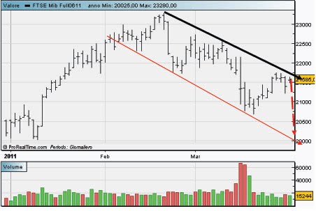 Area 21.750 rappresenta un punto nodale della nuova legge della vibrazione, ma come possiamo osservare dal grafico, essa rappresenta non solo il punto mediano del recente ribasso, ma anche il punto da dove passa una trend line ribassista.