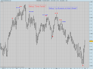 Nei grafici precedenti sono mostrati per gli anni 2009-2010 e 2011 i setup temporali individuati da “La Bussola di Wall Street” (segmenti blu) e “Time Factor” (segmenti rossi).