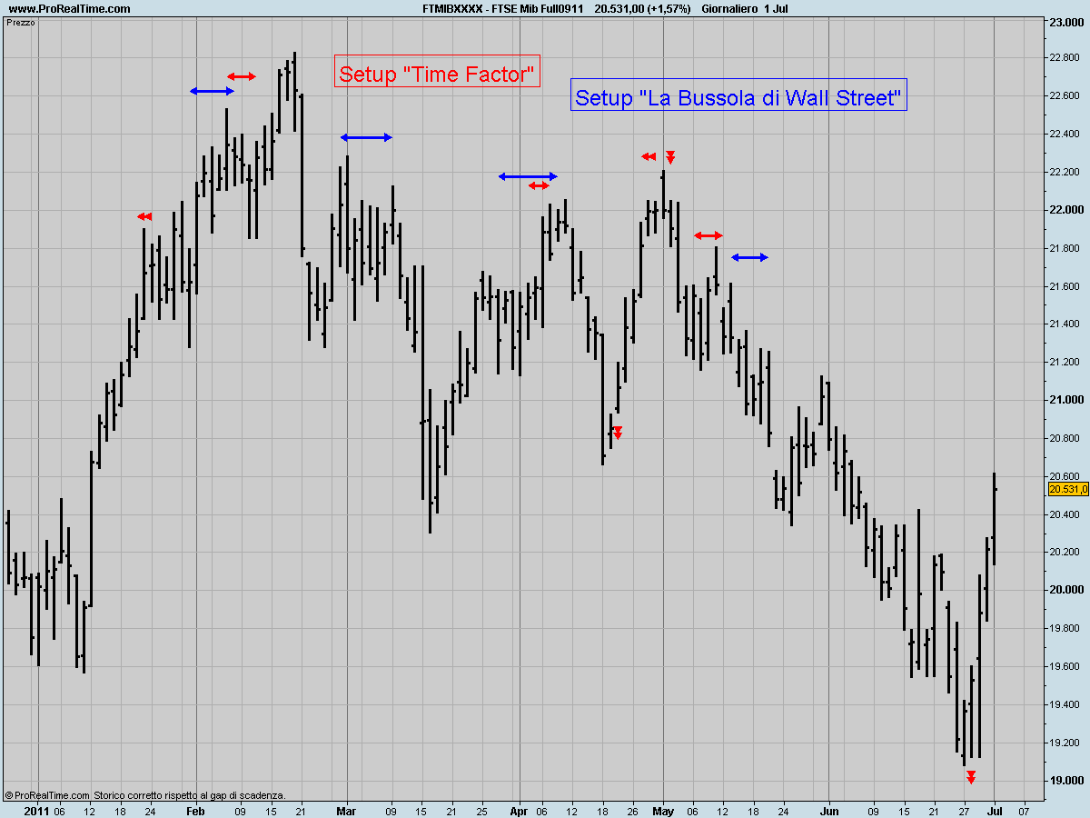 Nei grafici precedenti sono mostrati per gli anni 2009-2010 e 2011 i setup temporali individuati da “La Bussola di Wall Street” (segmenti blu) e “Time Factor” (segmenti rossi).