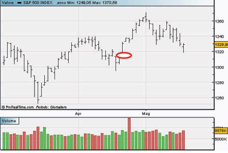Se osserviamo il grafico dello S&P 500 fra il 19 ed il 20 Aprile è stato lasciato aperto un vuoto fra area 1.313 e 1.320.
