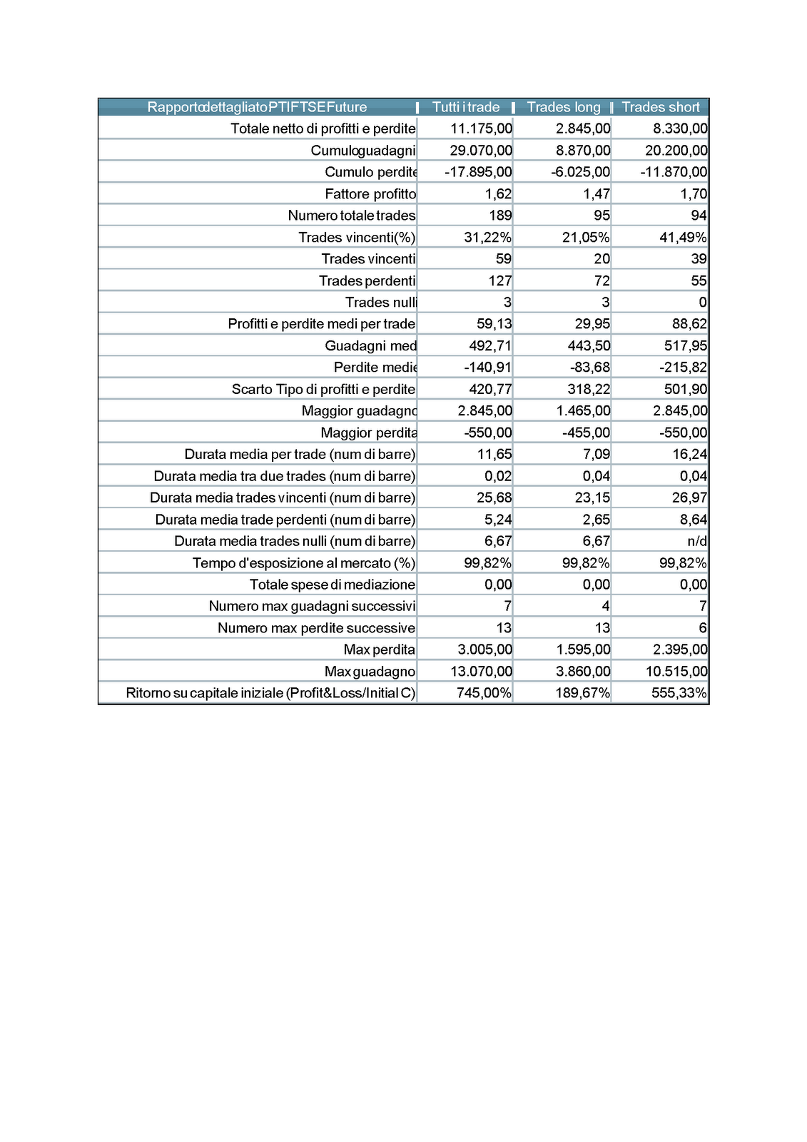 Come da storico (realizzato utilizzando il ProBackTest di Prorealtime, clicca qui) il TS sul time frame orario basato sul PTI dal 1 Gennaio 2007 al 31 Dicembre 2010 ha totalizzato