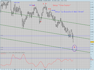 La “Nuova Legge della Vibrazione” (linee orizzontali blu) e “Running Bisector” (linee oblique verdi) ci dicono che il prossimo obiettivo del ribasso trovasi in area 18700-18500.