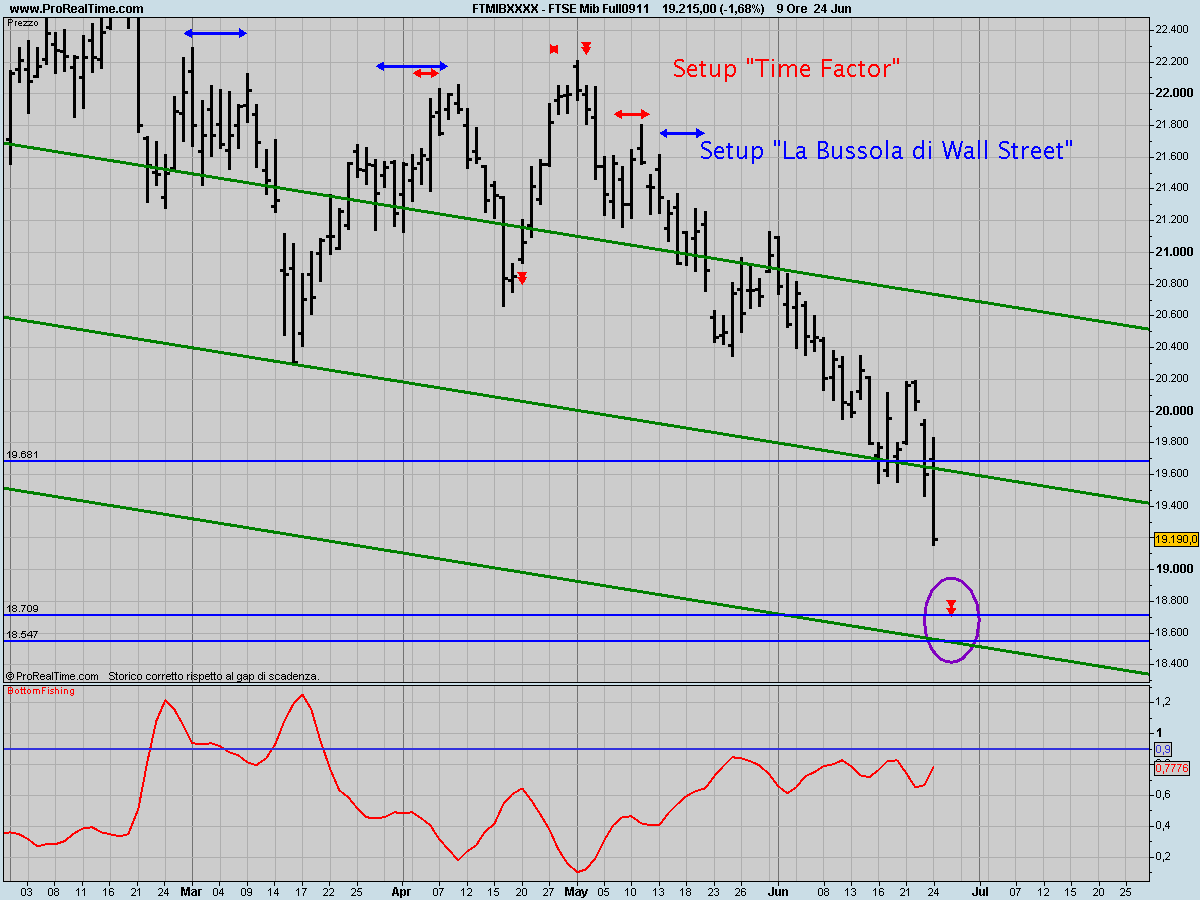 La “Nuova Legge della Vibrazione” (linee orizzontali blu) e “Running Bisector” (linee oblique verdi) ci dicono che il prossimo obiettivo del ribasso trovasi in area 18700-18500.
