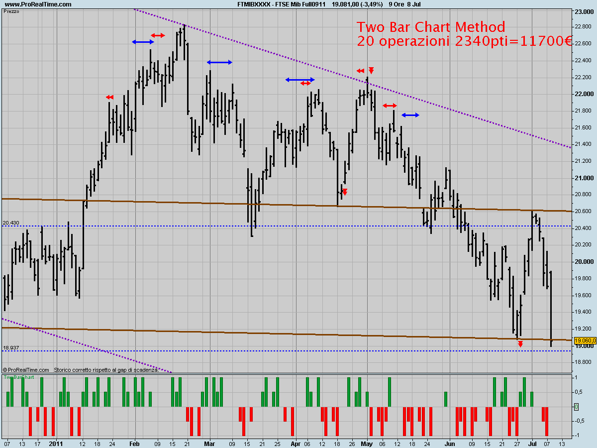Nel grafico precedente sono riportate tutte le operazioni effettuate utilizzando il metodo Two Bar Chart sul Future FTSE MIB dal 1 Gennaio 2011 ad oggi.